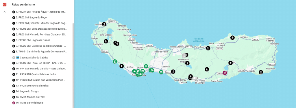 Para que puedas comprobar todas las rutas de un solo golpe de vista, y como ya es tradición en Destino y Maleta, hemos preparado un mapa interactivo de São Miguel con una capa dedicada exclusivamente a los trekkings de este artículo. El mapa general lo encontrarás en el artículo dedicado a qué ver en São Miguel por zonas, que seguro también te va a resultar muy útil para organizar tu viaje por la isla.