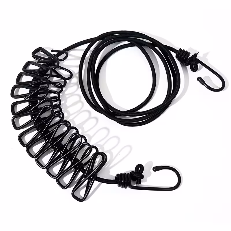 También están esas cosas que te dan autonomía sin hacer ruido, como la cuerda para tender (y sus pinzas) y el pequeño bote reutilizable con detergente para la ropa. Poder lavar una prenda puntual y dejarla secando por la noche te permite no cargar con ropa de más “por si acaso”, pero también sirve para darle un fregado a ropa de secado rápido cuando estás en climas húmedos y, o lavas la ropa o te mueres de la peste. Durante mucho tiempo llevamos cuerda y pinzas sueltas, hasta que encontramos una versión que ya las integra y tiene unos ganchos en los extremos para mayor comodidad, pero la lógica sigue siendo la misma: adaptarte sin depender de nadie más.